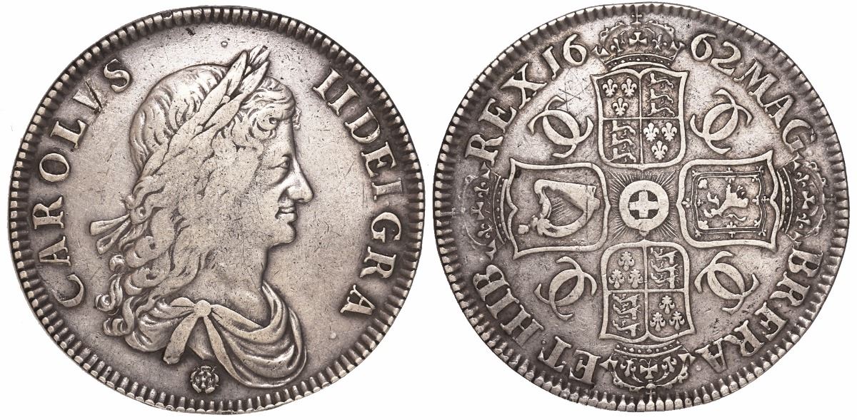 Great Britain, crown, Charles II, 1662. 29.70 grams. Bold VF with nice toning, no problems except for re-tooled V in king's name (no apparent reason).