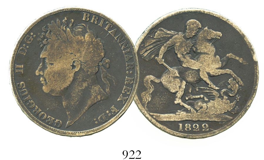 Great Britain, crown, George IV, 1822, TERTIO on edge, king's ordinal altered to II. Sp-3805; KM-680.2. 26.8 grams. Worn (Fine) but uncorroded, darkly toned, all details clear, the alteration of the king's ordinal inexplicable but clearly done in the 1800s. Recovered from: Unidentified mid-1800s wreck in the English Channel