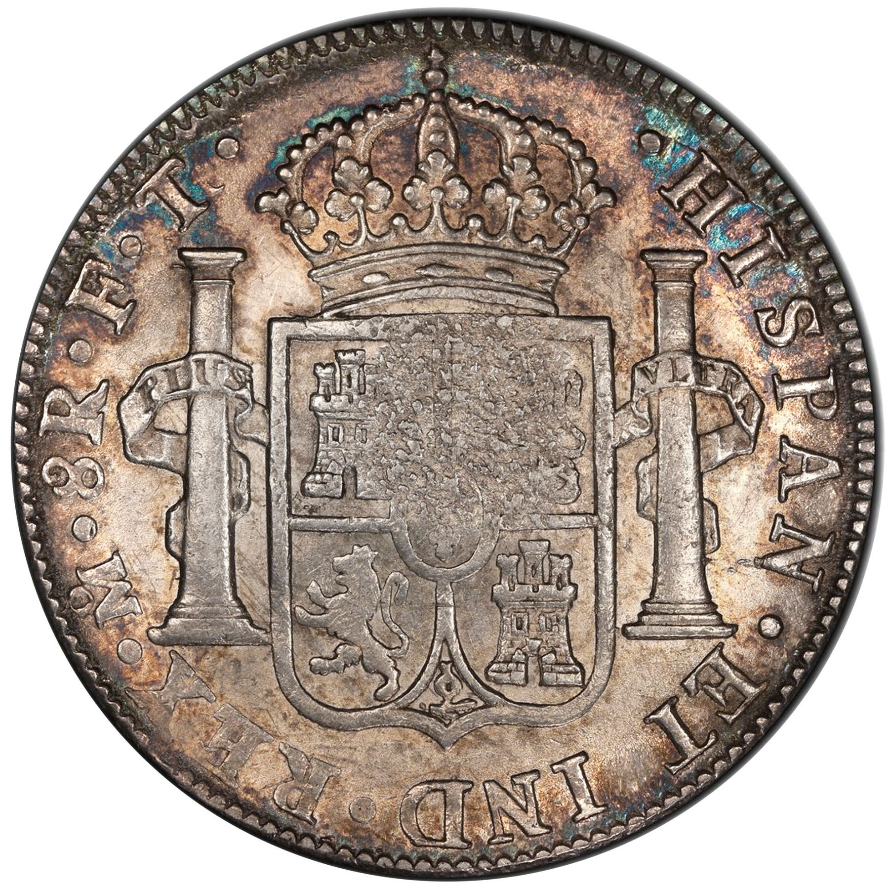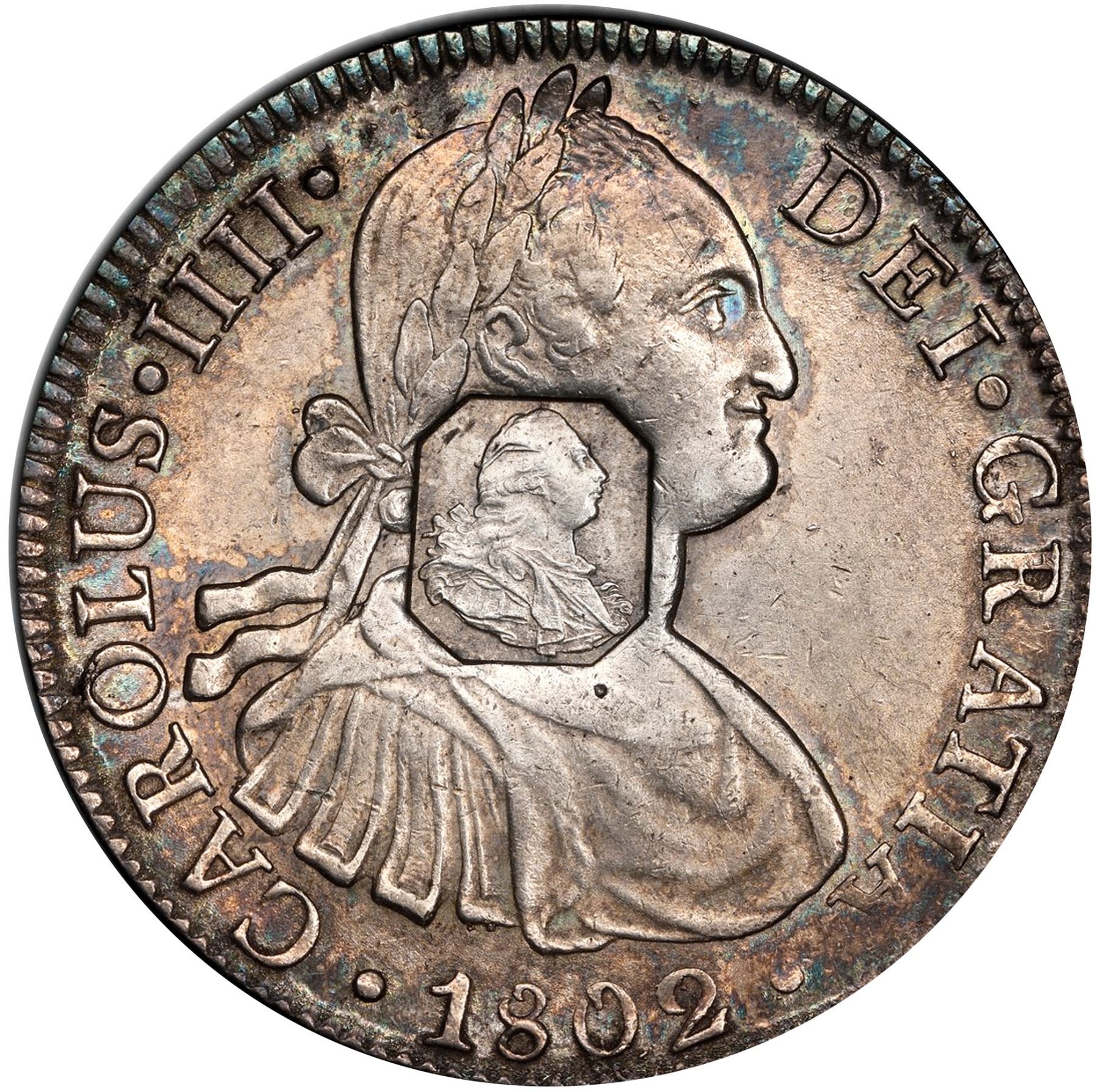 Great Britain, dollar, octagonal George III countermark (ca. 1804) on obverse of a Mexico City, Mexico, bust 8 reales, Charles IV, 1802 FT, PCGS AU58, c/m AU details. Sp-3766; KM-656. Lustrous host with vivid toning at rims, fully detailed countermark (deeply impressed for the type), choice grade (second finest in PCGS census).