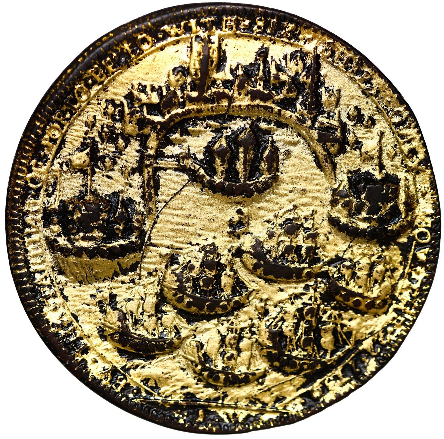 Great Britain, gilt copper alloy Admiral Vernon medal, 1739, Vernon and Fort Chagre / Porto Bello, ex-Adams. AC-FCv5D. 16.54 grams; 40 mm. Bold XF details with very bright gold gilding all over except where worn away on coppery high points, dentillated rims. XRF: 11.85% gold, 38.96% copper, 44.52% zinc, 2.82% lead. Pedigreed to the John Adams Collection (with his handwritten tag).
