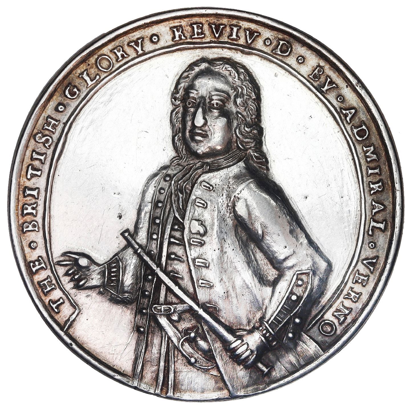 Great Britain, silver Admiral Vernon medal, 1739, Vernon / Porto Bello, rare, ex-Adams, DNW cover piece. AC-PBv26V. 16.98 grams; 38 mm. Bright, lightly hairlined AU with light toning in crevices (dark spot below Vernon's elbow, the light ridges in obverse fields not damage but a characteristic of flan-casting known as chasing), very sharply struck (especially for silver) and rare like all silver examples but probably the most prevalent variety in that metal, a real showpiece for its quality of detail. XRF: 96.73% silver, 1.39% copper, 1.38% tin. Pedigreed to the John Adams Collection (with his handwritten tag) and plated on the cover of the Dix Noonan Webb auction catalog of June 2009 (lot 2037).