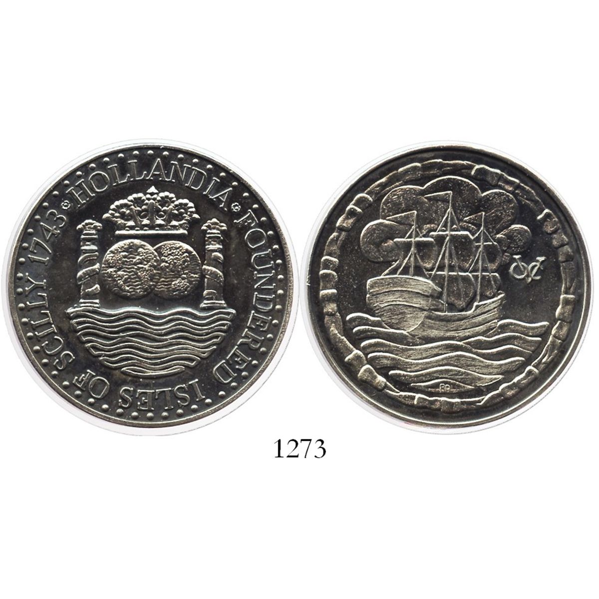 Great Britain, silver Hollandia medallion (ca. 1987), made from silver from the ship. 30.1 grams. From a design engraved by Ron Dutton and marketed by Simmons Gallery, struck in a pillar dollar design with the legend HOLLANDIA FOUNDERED ISLES OF SCILLY 1743 on the obverse and a picture of the ship with the VOC (Dutch East India Co.) monogram on the reverse, with official hallmarks on edge, toned Mint State. With blue clamshell presentation case, booklet and certificate.