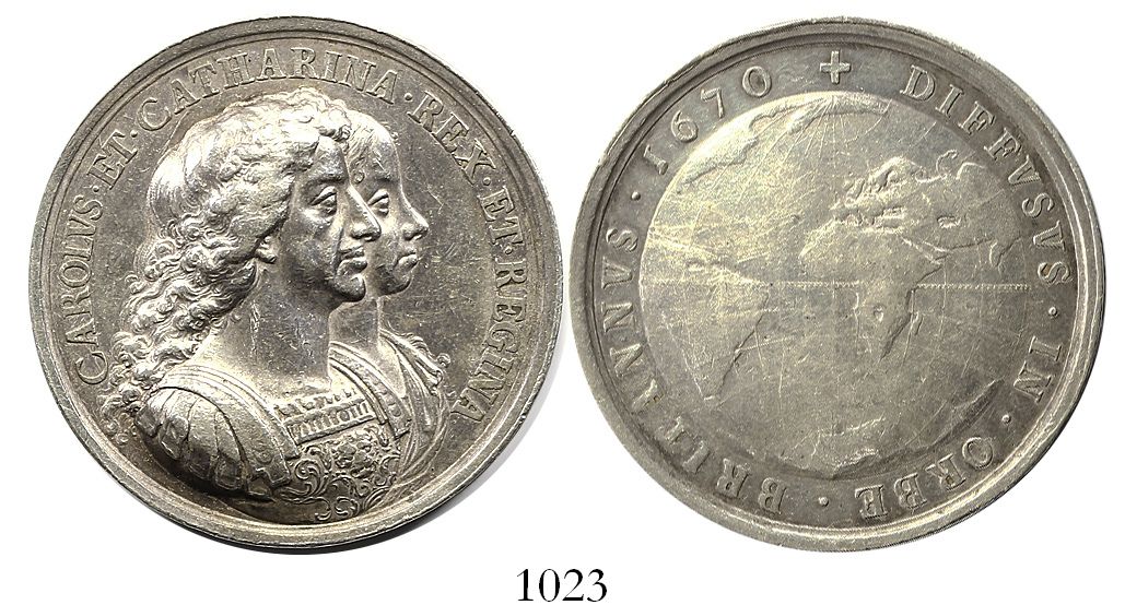 Great Britain, silver medal, Charles II, 1670, British colonization. Betts-44; Eimer-245. 33.28 grams. High relief obverse showing the king and queen, with globe-map in lower relief on reverse, designed by Roettier to announce Britain's reach around the world, problem-free VF with lustrous fields and very light toning, a perennial favorite at auctions with plenty of four-figure sales figures.