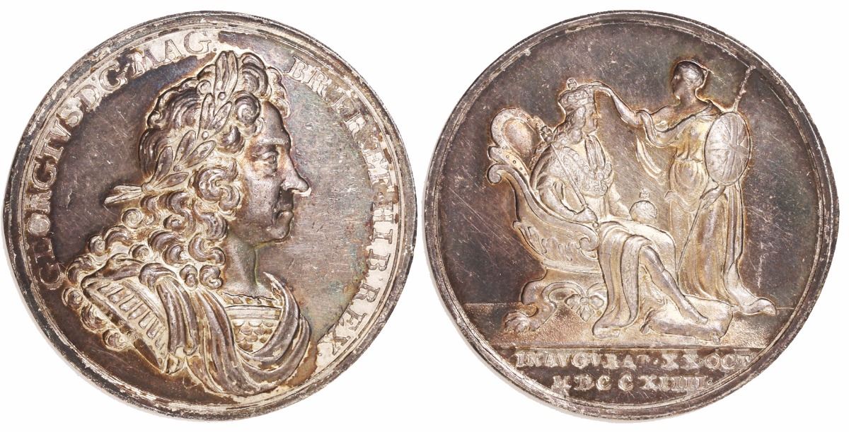 Great Britain, silver medal, George I, 1714, coronation. 15.72 grams, 34mm. Choice AU with attractive rainbow toning and brilliant underlying luster, minor hairlines and marks, elegant design by Croker showing Britannia crowning the king on reverse.
