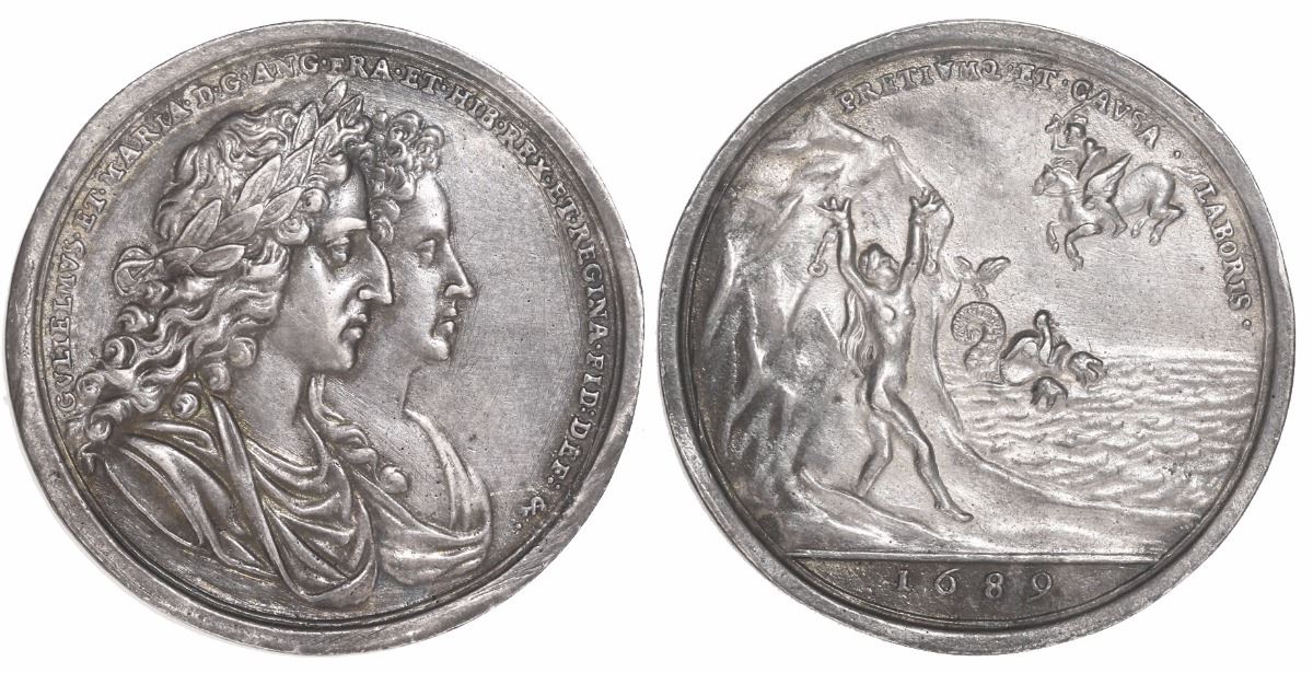 Great Britain, silver medal, William and Mary, 1689, coronation. 9.11 grams, 37mm. Bold and attractively toned XF with hint of luster, old scratches, neat design (by Bower) with Perseus saving Andromeda from the sea-monster on reverse.