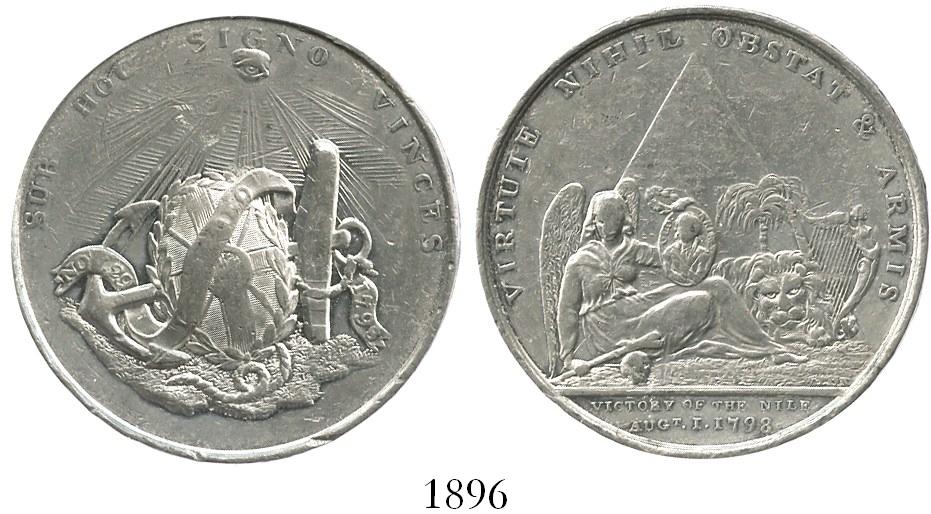 Great Britain, silver-plated bronze medal, Victory of the Nile, 1798. Brown-450. 19.9 grams. High-relief AXF, lustrous but with lots of small marks, executed by Thomas Wyon to celebrate Nelson's victory over the French at the Nile River in 1798.