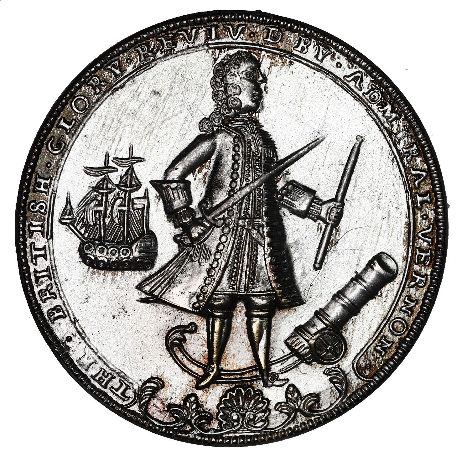 Great Britain, silver-plated copper alloy Admiral Vernon medal, 1739, Vernon and ship and cannon / P