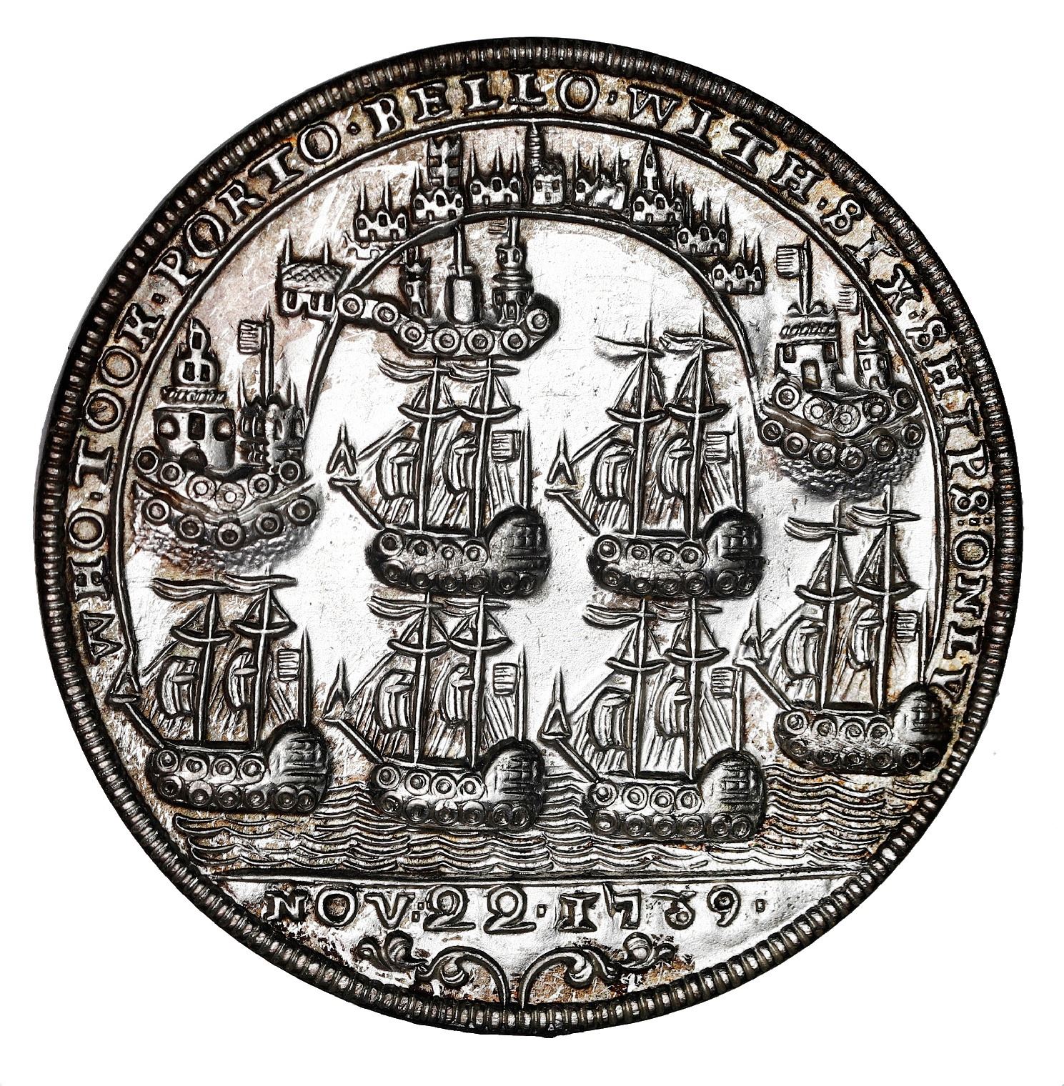 Great Britain, silver-plated copper alloy Admiral Vernon medal, 1739, Vernon and ship and cannon / Porto Bello, ex-Adams (plate). AC-PBvi23MM. 11.97 grams; 38 mm. Very bright UNC (the AC photo deceivingly dark) with discoloration at top where mount was removed, very sharply detailed from choice strike on a typically cast planchet that shows some light chasing and granularity in fields. XRF: 5.07% silver, 39.53% copper, 48.87% zinc, 5.34% lead. Pedigreed to the John Adams Collection (with his handwritten tag), plated on page 110 of Medallic Portraits of Admiral Vernon (2010), by Adams and Chao, acquired from Spink & Son, Ltd (King St, London, with their original tags).