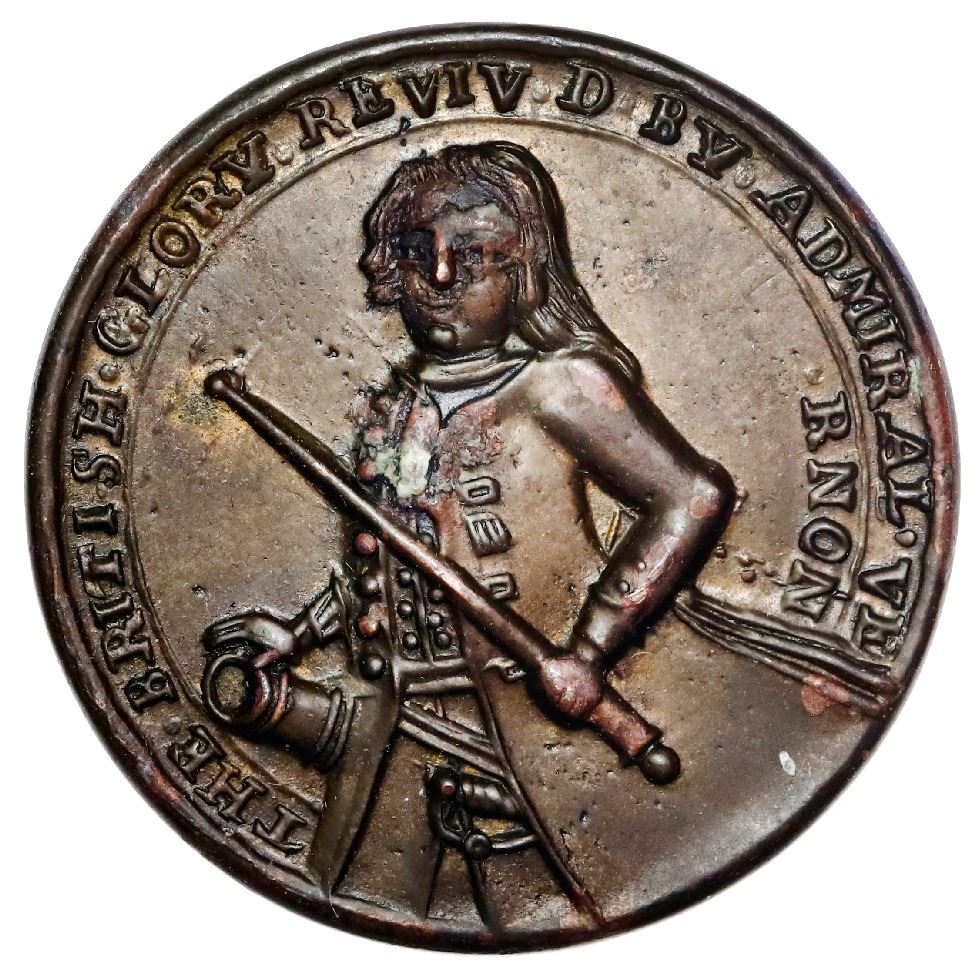 Great Britain, small copper alloy Admiral Vernon medal, 1739, Vernon / Porto Bello, very rare, ex-Adams (Plate). AC-PBv51ZZ. 5.73 grams; 27 mm. Very choice three-dimensional portrait with no flattening or wear, UNC with two spots of dark oxidation on reverse, faint traces of luster, rated RR in AC with only two examples reported, this one no doubt the finer, acquired by Adams in 1984. XRF: 49.16% zinc, 48.90% copper, 1.08% lead. Pedigreed to the John Adams Collection (with his handwritten tag), plated on page 86 of Medallic Portraits of Admiral Vernon (2010), by Adams and Chao.