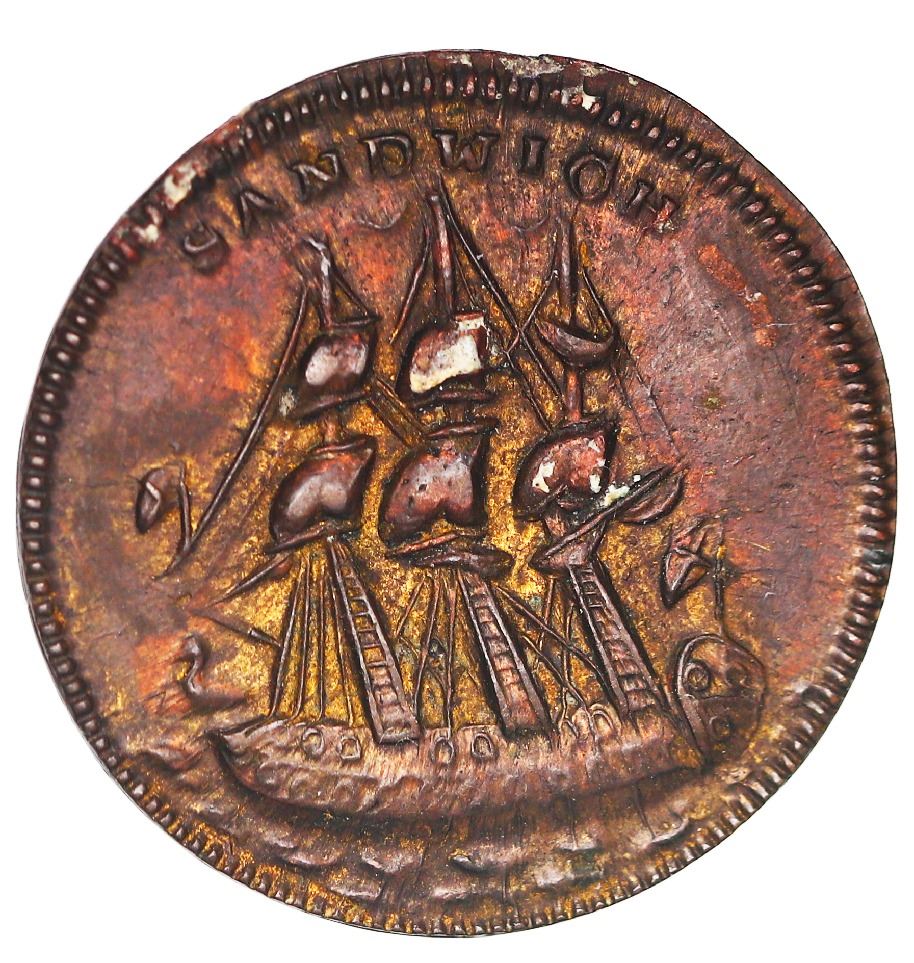 Great Britain, small copper medal, 1781, Admiral G.B. Rodney / HMS Sandwich. BHM-237. 3.25 grams; 24 mm. Obverse with bust of Admiral Rodney facing right, G.B. / RODNEY; reverse with HMS Sandwich sailing left, SANDWICH above; plain edge. Commemorating Admiral Rodney's capture of Saint Eustatius from the Dutch and munitions meant for George Washington's army. AU with pair of thin scratches in front of the bust.