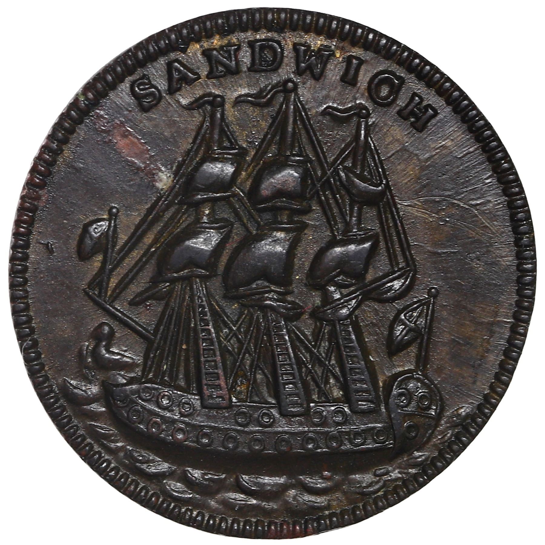 Great Britain, small copper medal, 1781, Admiral G.B. Rodney / HMS Sandwich. BHM-237. 3.42 grams, 24 mm. Obverse: bust of Admiral Rodney facing right, G.B. / RODNEY. Reverse: HMS Sandwich sailing left, SANDWICH above. Edge: smooth. Nice AU example of this popular small-size medal commemorating Admiral Rodney's capture of Saint Eustatius from the Dutch and munitions meant for George Washington's army.