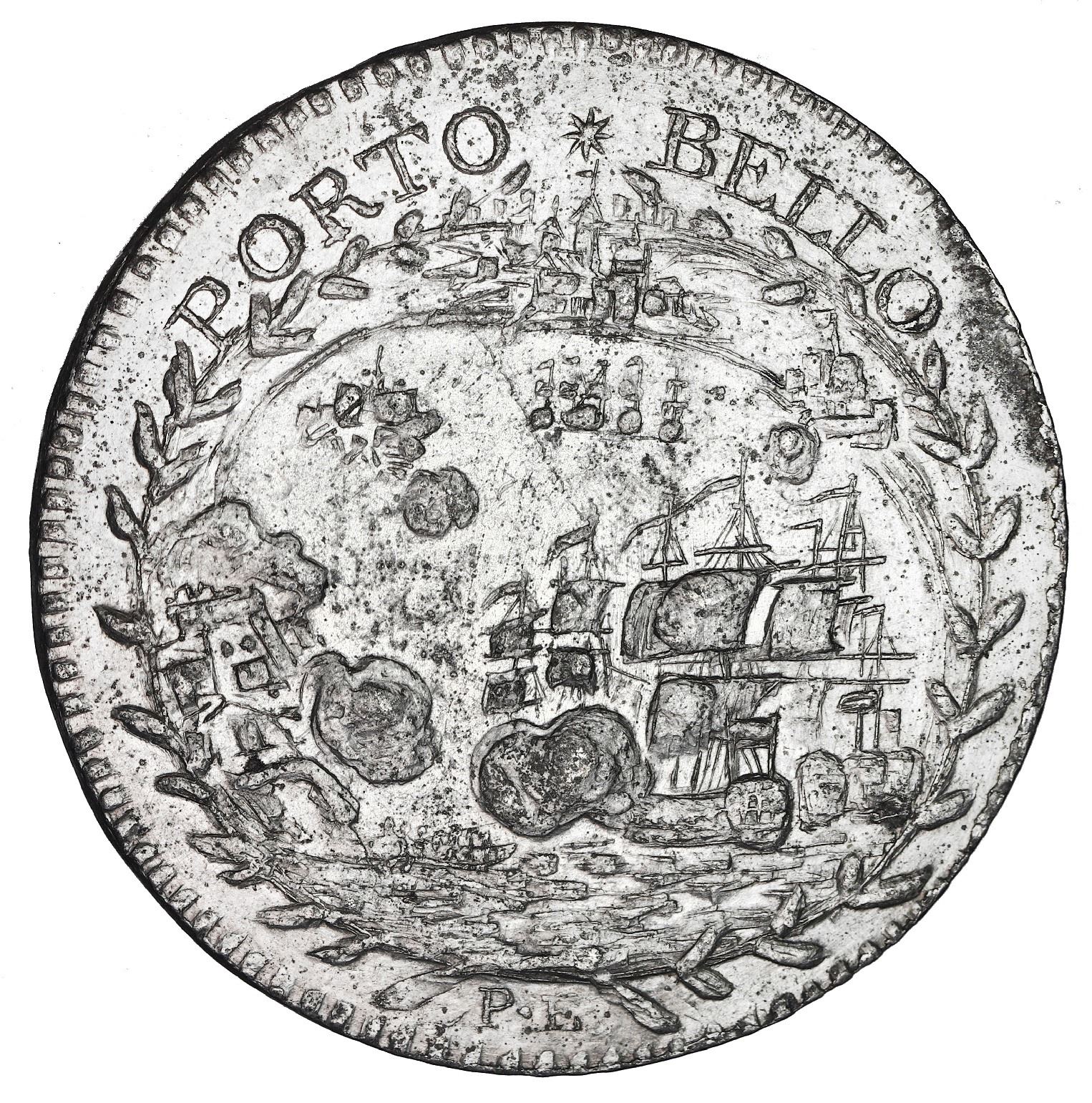 Great Britain, tin Admiral Vernon medal, 1740, Vernon's flagship / naval scene, extremely rare, ex-Adams (plate), ex-Finn. AC-PB1A. 19.87 grams; 40 mm. Bright and lustrous AU with slightly convex obverse (indicative of a "sophisticated shop," according to Adams and Chao) showing Vernon's flagship above the date 1740, which is a bit of a mystery since the reverse shows two ships firing on forts under the name PORTO BELLO (a battle that took place in 1739). One of the rarest medals (only three reported) and clearly different from the usual series both in execution and metallic content (XRF: 98.12% tin). Pedigreed to the John Adams Collection (with his handwritten tag), plated on page 46 of Medallic Portraits of Admiral Vernon (2010), by Adams and Chao, and to the Leonard Finn Collection.