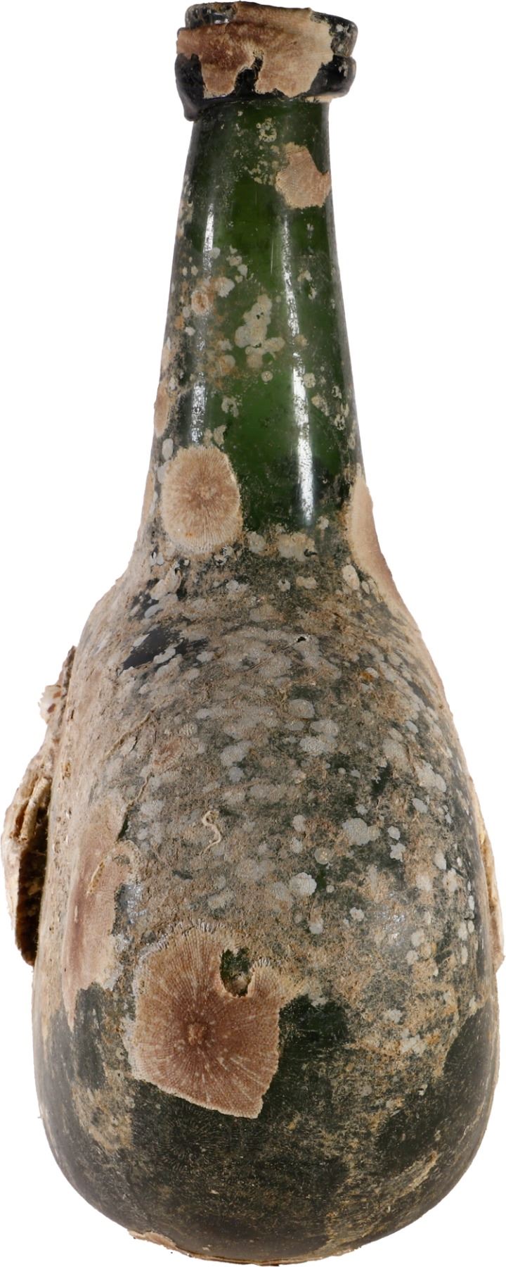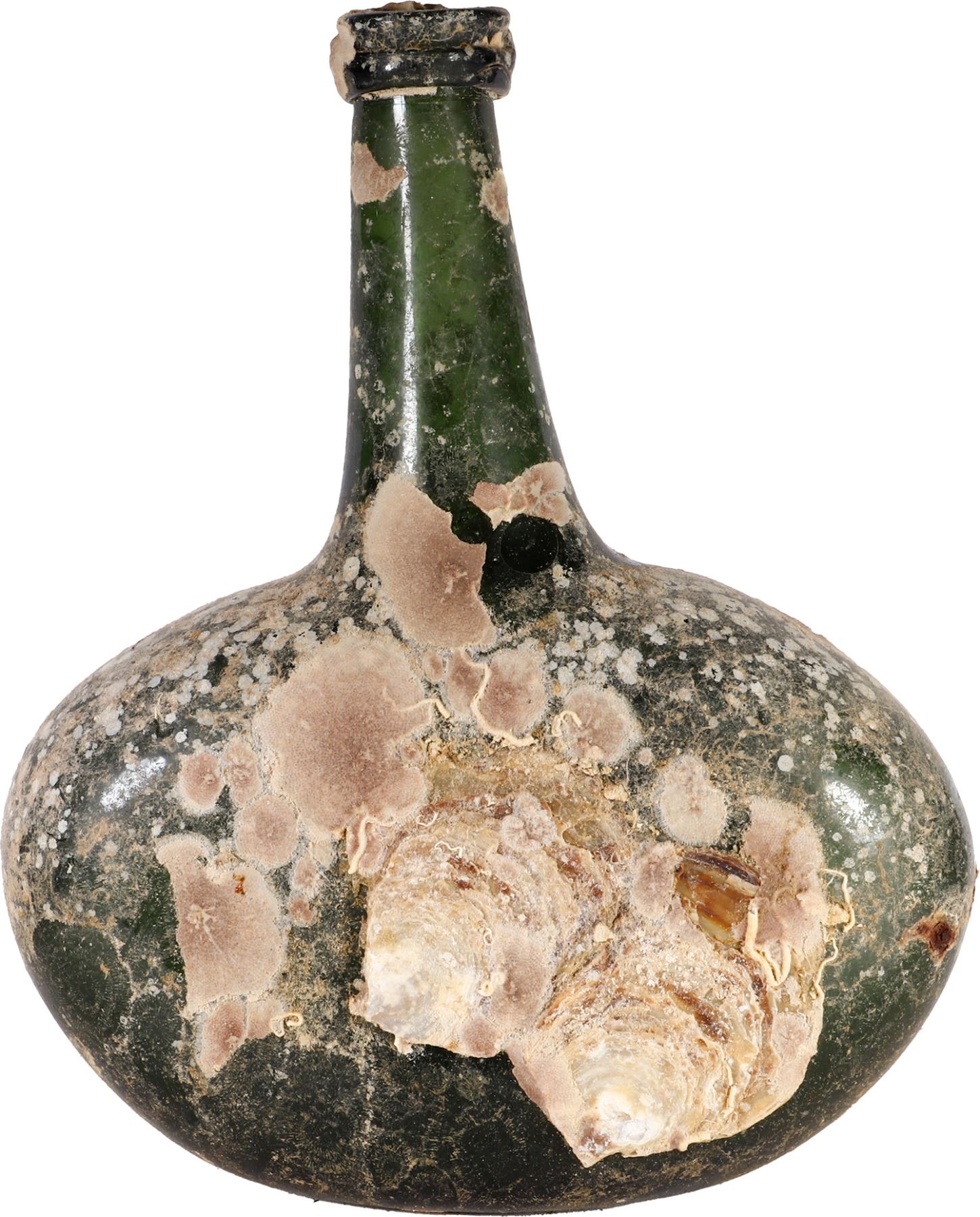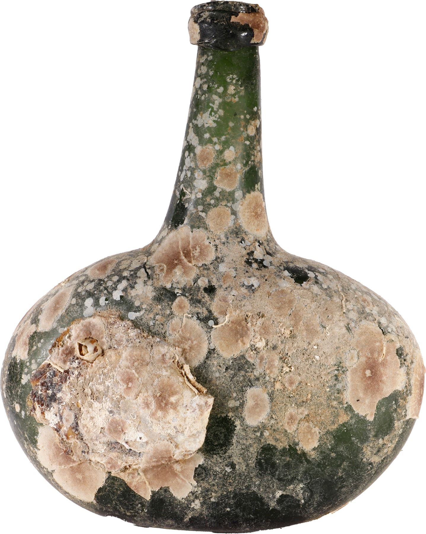 Green glass flat-sided onion bottle with encrustation, 1700s. 546 grams. 8" tall, 6½" wide, 3" deep. Rare design and first we have offered, dusty with sea sedimentation all over including a large flat shell affixed to one side, amazingly intact with some of deep green glass showing through, found in southern Haiti. Pick up recommended; special shipping costs apply.