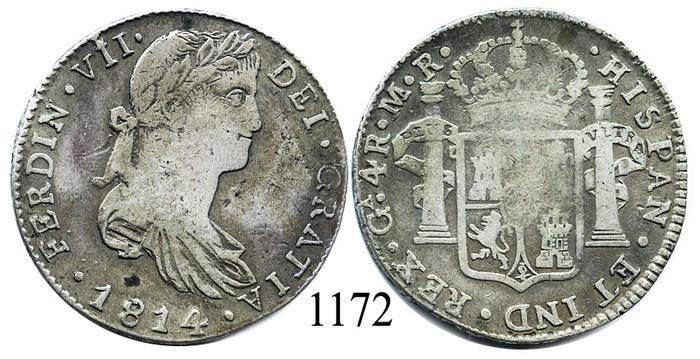 Guadalajara, Mexico (War for Independence), bust 4 reales, Ferdinand VII, 1814MR, large bust. KM-102.3. 13.1 grams. Nicely toned AVF with weak centers, curious early bust.