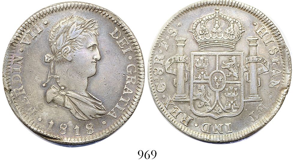 Guadalajara, Mexico, bust 8 reales, Ferdinand VII, 1818FS. KM-111.3; CT-440. 26.66 grams. Deeply rainbow-toned XF with crude rims (as made), broad flan, impressively bold overall.