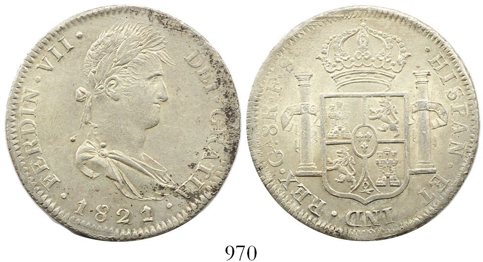Guadalajara, Mexico, bust 8 reales, Ferdinand VII, 1821/2FS. KM-111.3; CT-443. 26.93 grams. Mint State with muted luster (very choice grade), slightly crude rims as usual, incipient toning (a few minor black spots), an exceptional example overall.