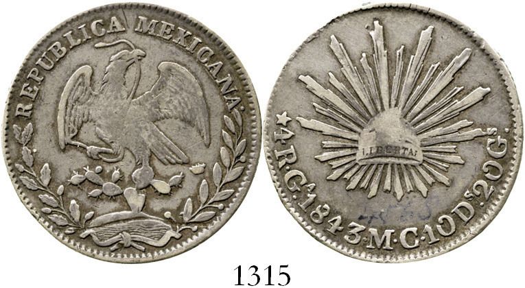 Guadalajara, Mexico, cap-and-rays 4 reales, 1843MC. KM-375.2. 13.3 grams. Decent VF with attractive toning, bold details, parts of rim crude (as made).