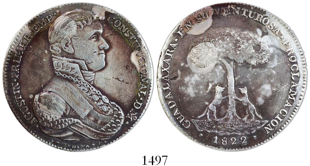 Guadalajara, Mexico, silver proclamation medal, Agustin Iturbide, 1822, engraved by V. Medina. Grove-27a. 26.92 grams, 39.5mm. Toned XF with egregious spots of no toning, a few marks on face and in reverse field.