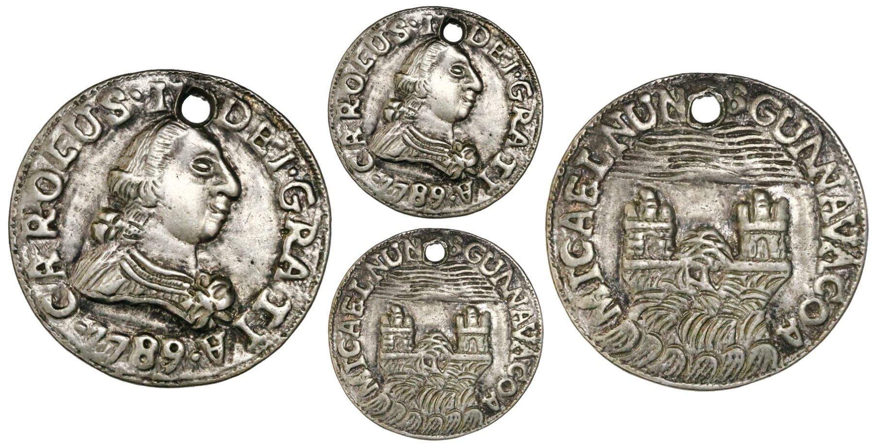 Guanabacoa, Cuba, cast silver 4 reales-sized proclamation medal, Charles IV, 1789, very rare, PCGS genuine. Herrera-139; Medina-159. 11.64 grams. Like the prior lot, Cuban proclamation medals were cast in limited numbers in 1789. Although of a similar crudity when compared to the 1747 issues, the medals designed by Miguel Nunes of Guanabacoa display more details. On this example, the face, hair, and clothing of Charles IV are well defined. Likewise, the clouds, castle, and waves on the reverse, while handcrafted, are quite bold. Obverse: bust of Charles IV at center, 1789 below, legend around reading CHARLES IV DEI GRATIA; reverse: two castles with mountain in between, waves below and clouds above, legend MICHAEL NUNES GUANAVACOA. AU for grade with the typical hole at top (as noted on slab label), nice original surfaces with some luster and mostly silver color and a few spots of dark toning. PCGS #36211864.