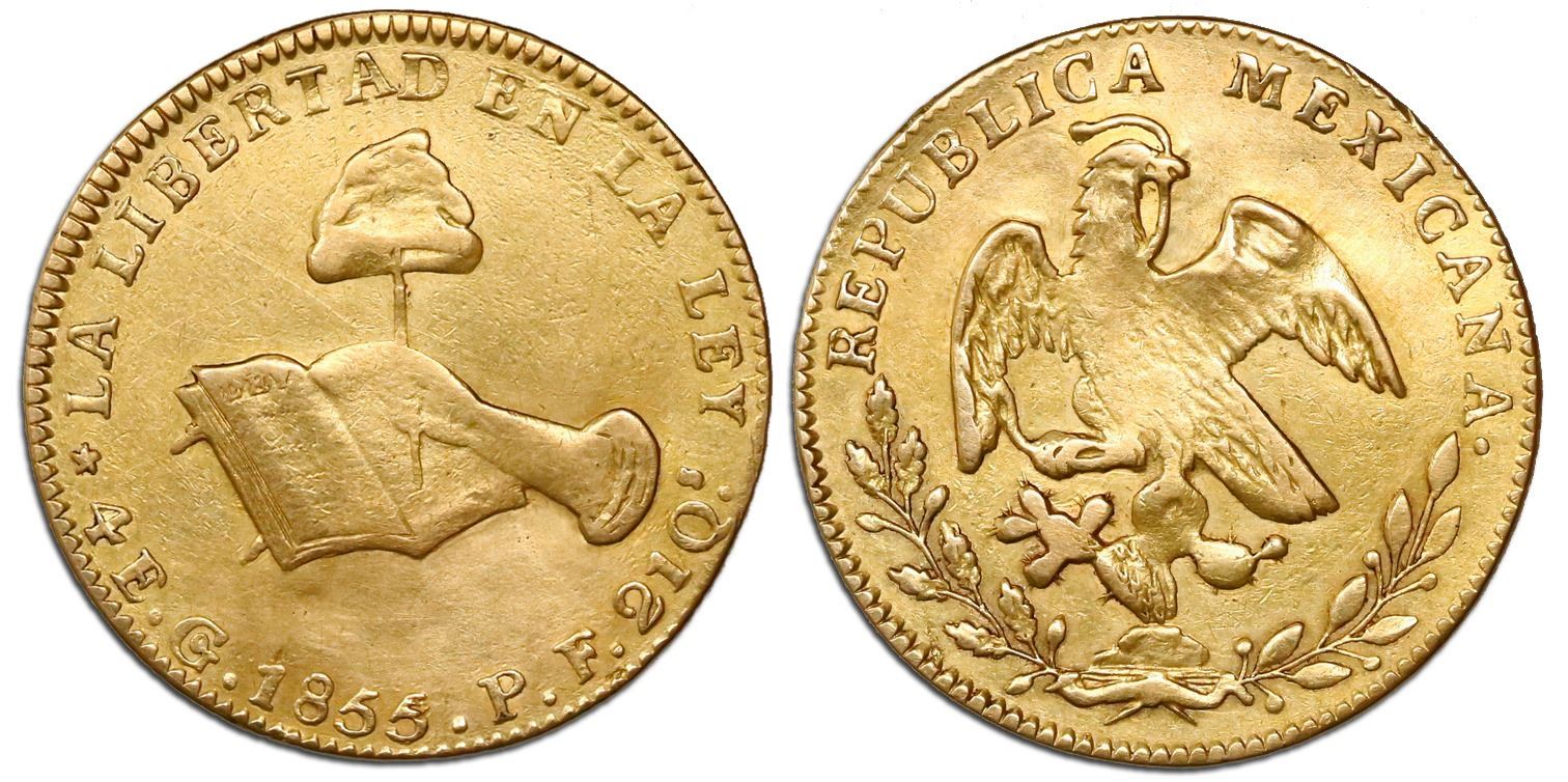 Guanajuato, Mexico, 4 escudos, 1855PF. KM-381.4. 13.49 grams. Cleaned VF with good details.