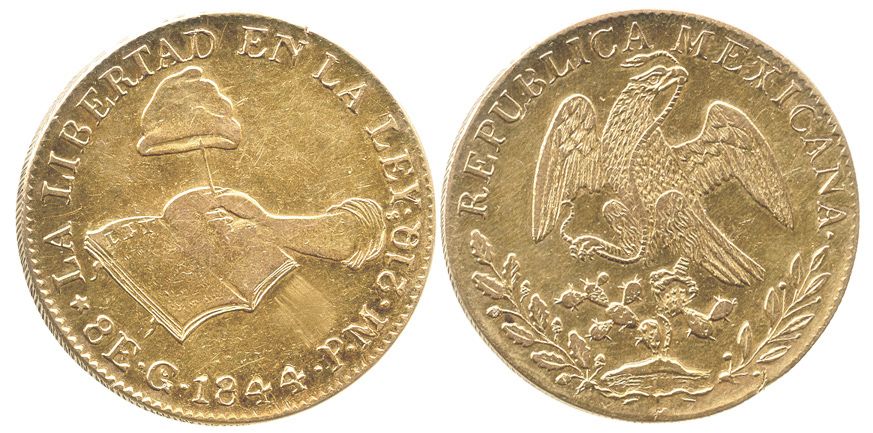 Guanajuato, Mexico, 8 escudos, 1844-PM. KM-383.7. 25.0 grams. Lightly polished XF+ with fine old scratches.