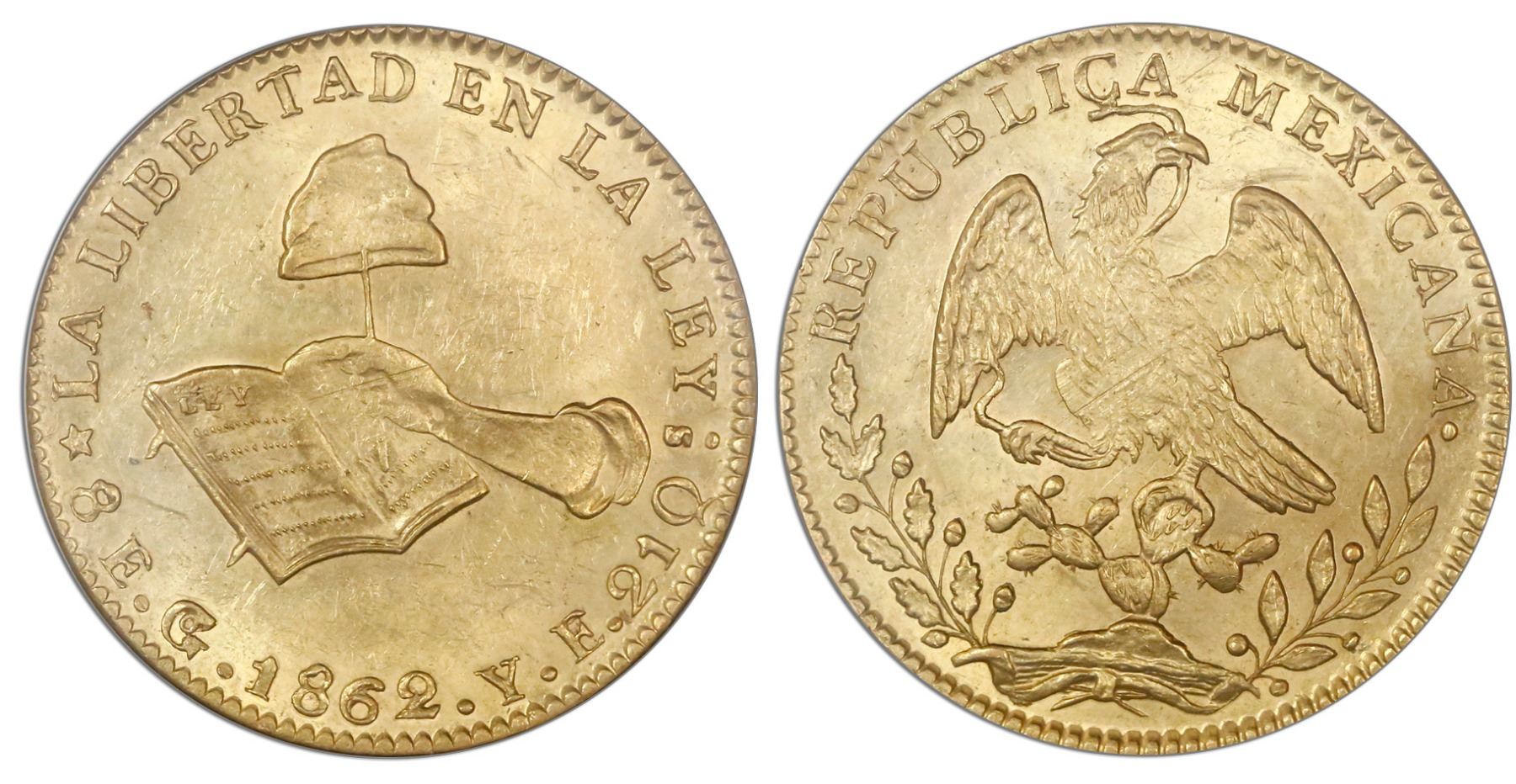Guanajuato, Mexico, 8 escudos, 1862YE, NGC MS 62. KM-383.7; Fr-72. Medium luster, nice strike except for weakness in very centers (also with adjustment marks there on the eagle side), choice grade overall. NGC #583991-012.