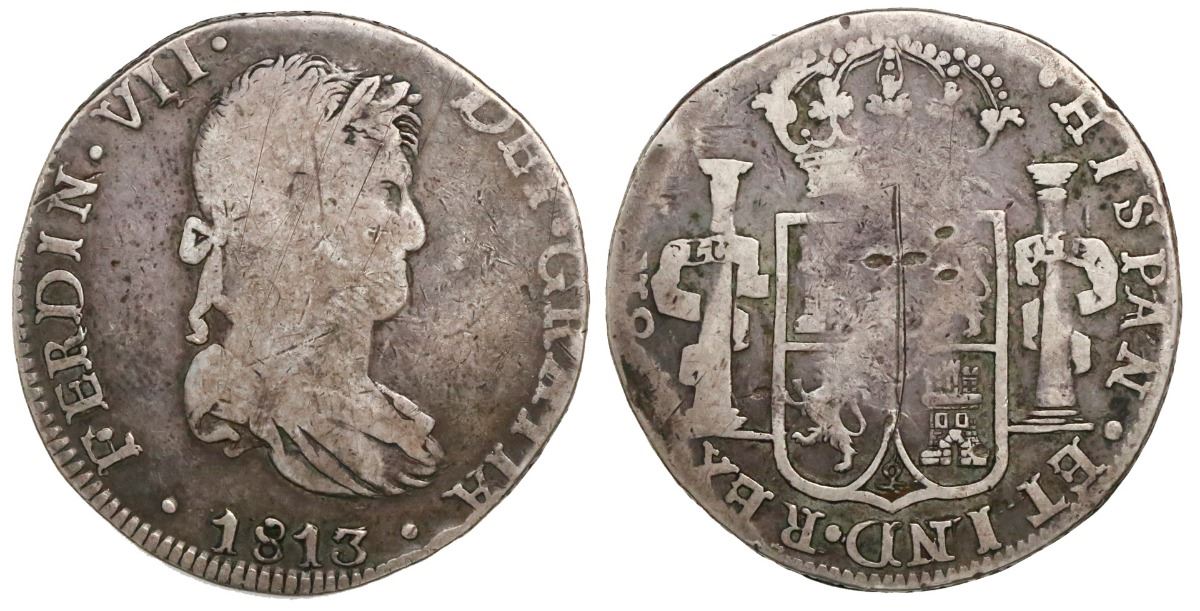Guanajuato, Mexico, bust 8 reales, Ferdinand VII, 1813JJ. Calbeto-126; CT-551; KM-111.4. 26.31 grams. Despite lacking some details due to truncation and crudeness near edge (out-of-round flan), this coin is clearly a Guanajuato mint product based on the notched serifs in the date and elsewhere, the tip of the first "J" is likewise visible, eliminating the possibility of any other War of Independence mint. Toned Fine with test marks and scratch on arms.