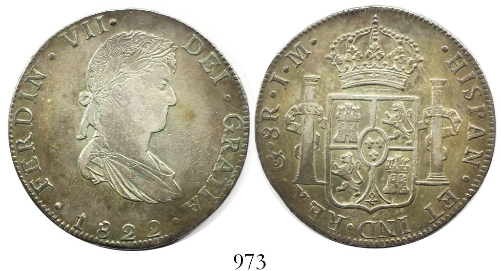 Guanajuato, Mexico, bust 8 reales, Ferdinand VII, 1822JM. KM-111.4; CT-454. 26.75 grams. Rainbow-toned XF+, unusually well struck for the issue, parts of rims slightly crude, hint of underlying luster.