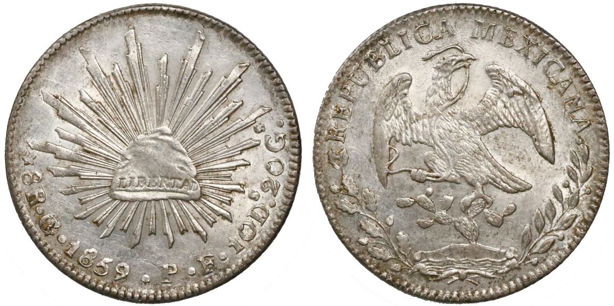 Guanajuato, Mexico, cap-and-rays 8 reales, 1859/8PF.