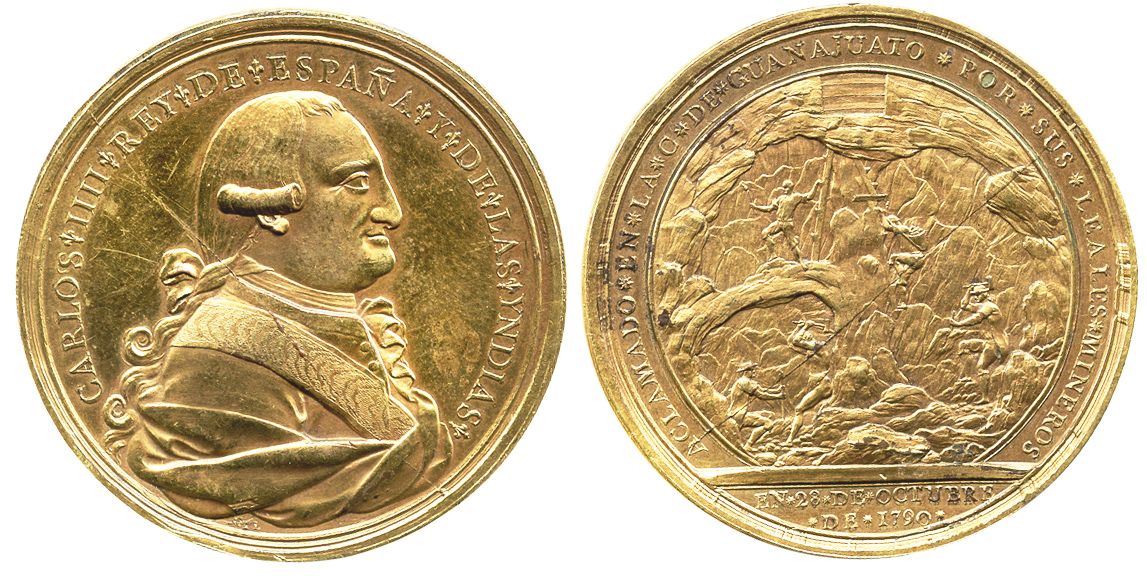Guanajuato, Mexico, gilt bronze proclamation medal, Charles IV, 1790, Los Mineros.