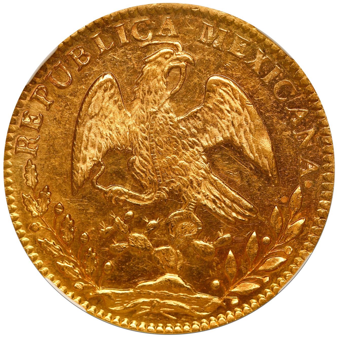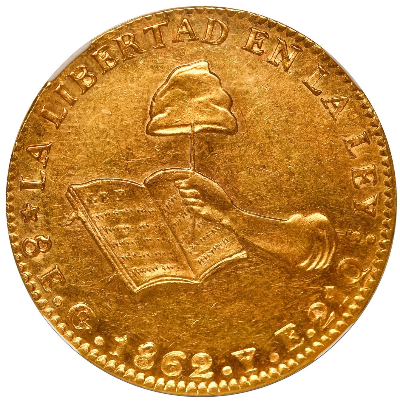 Guanajuato, Mexico, gold 8 escudos, 1862 YE, NGC MS 60. KM-383.7. Choice strike and nice luster for the grade, no doubt assigned based on hairlines and small marks in obverse field.