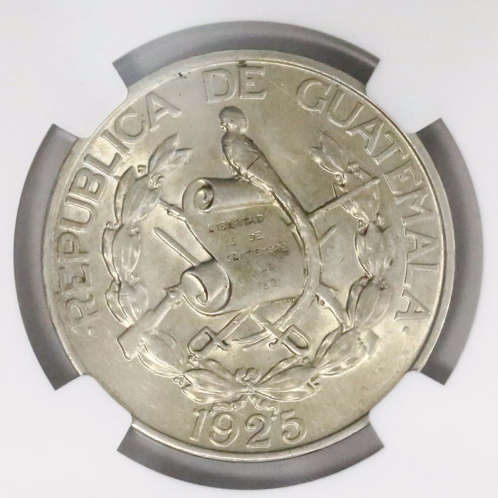 Guatemala, 1/2 quetzal, 1925, encapsulated NGC AU 58. KM-241.1. 16.62 grams. Very light splashes of rainbow colors over muted luster, the open fields with faint hairlines. NGC #2727160-010.
