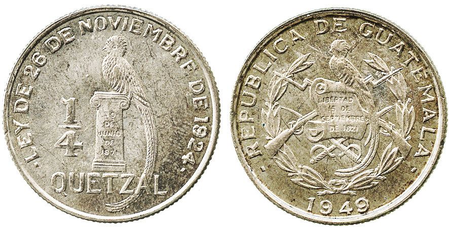 Guatemala, 1/4 quetzal, 1949. KM-243.2. 8.3 grams. Lustrous Mint State with incipient toning near rims.