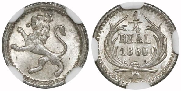 Guatemala, 1/4 real, 1860, NGC MS 67, finest known in NGC census, ex-Richard Stuart (stated on label