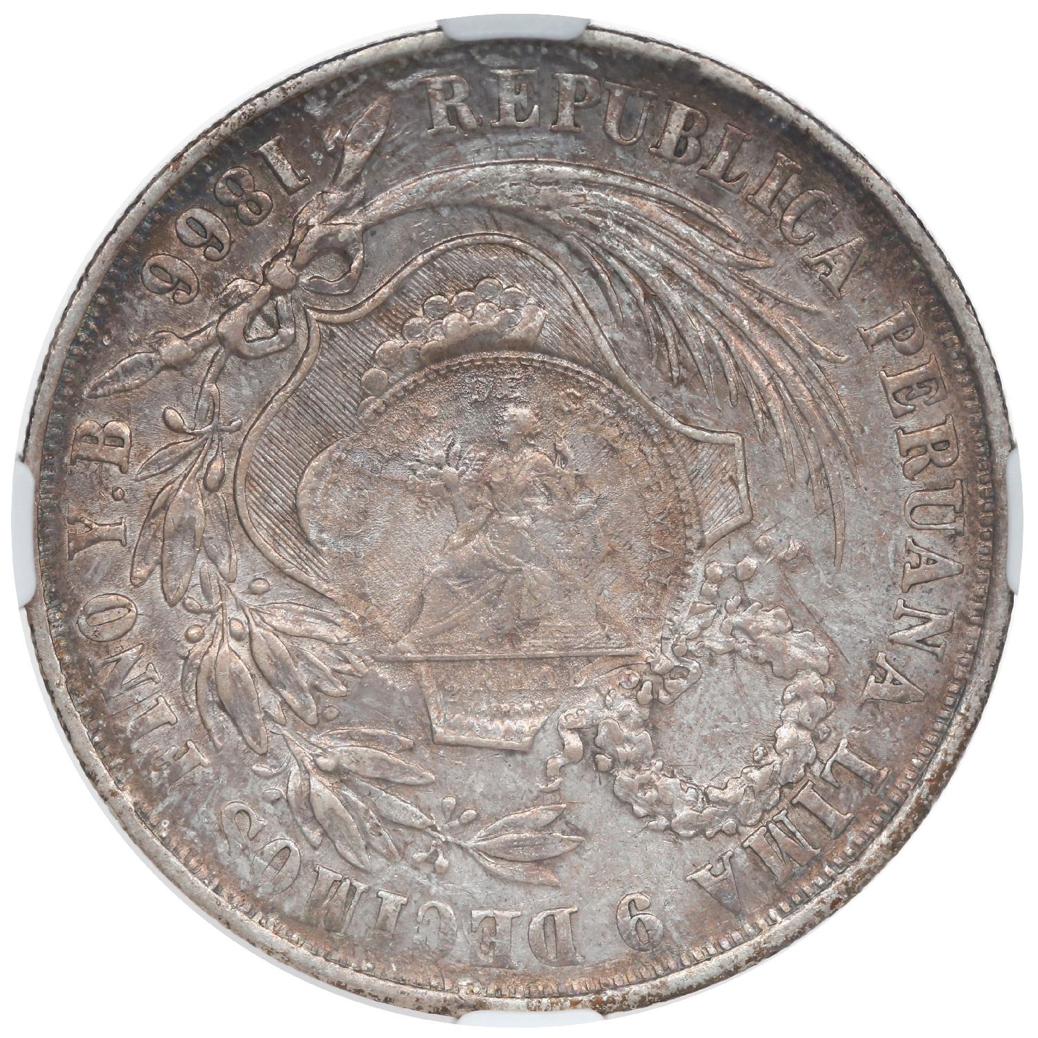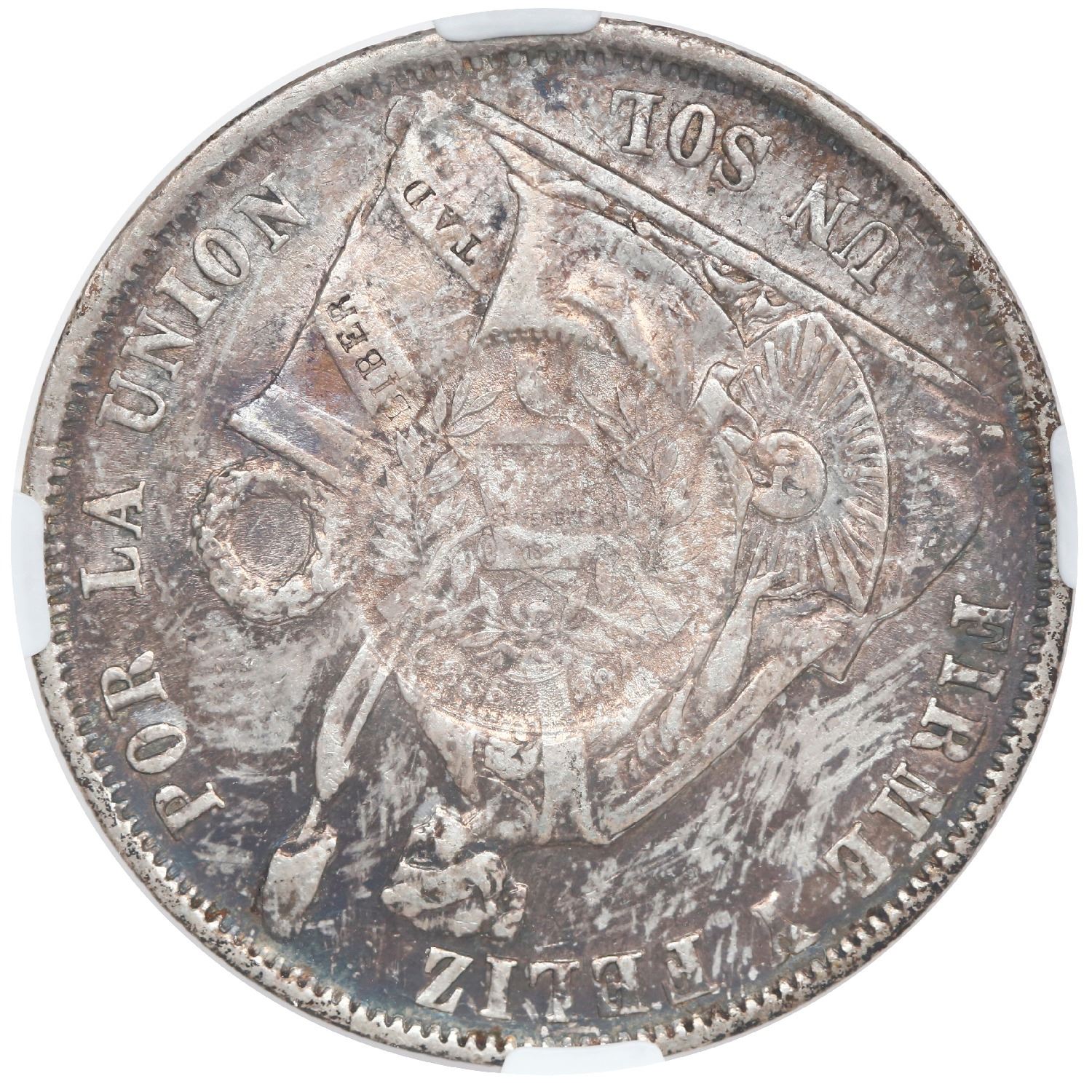 Guatemala, 1 peso, "1/2 real" counterstamp of 1894 on a Lima, Peru, 1 sol, 1866/56 YB, NGC AU 55, c/s UNC standard. KM-224. Attractive rainbow-toned piece with plentiful original luster, sharply struck counterstamp with full details.