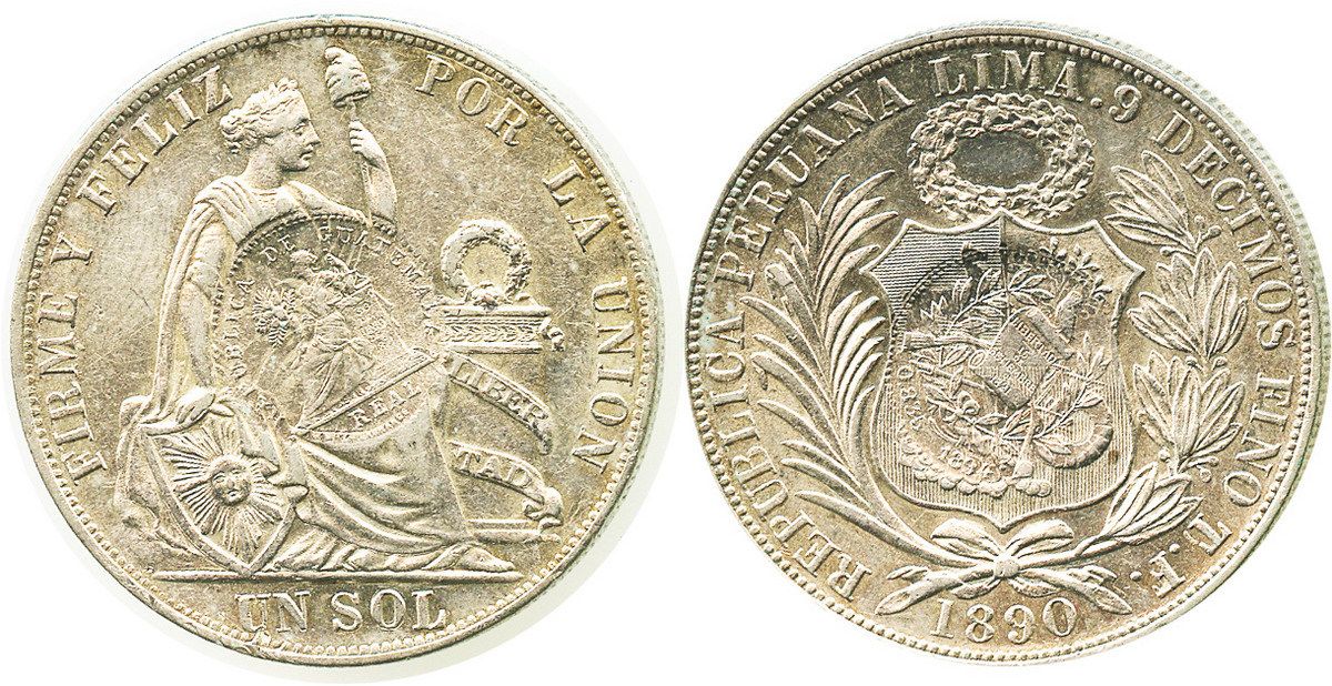 Guatemala, 1 peso, "1/2 real" counterstamp of 1894 on a Lima, Peru, 1 sol of 1890TF.