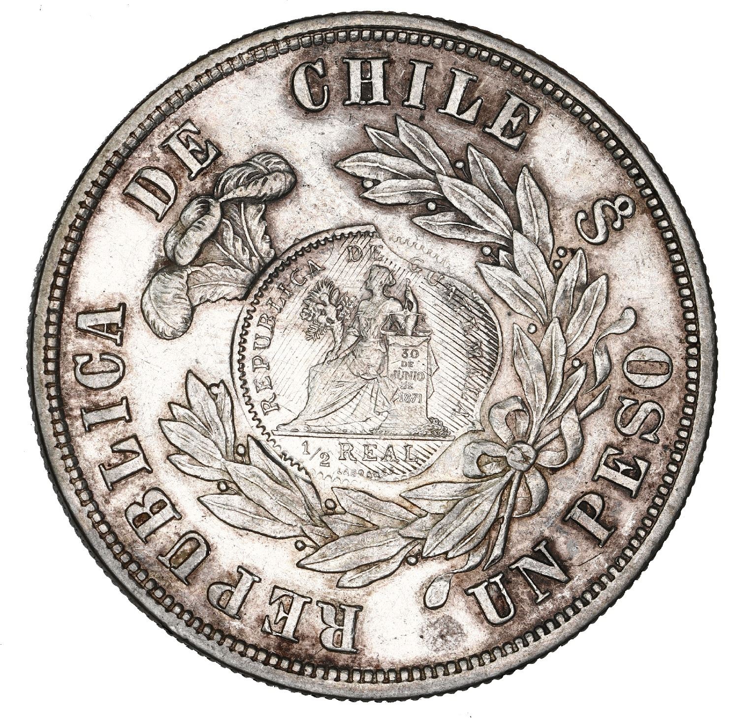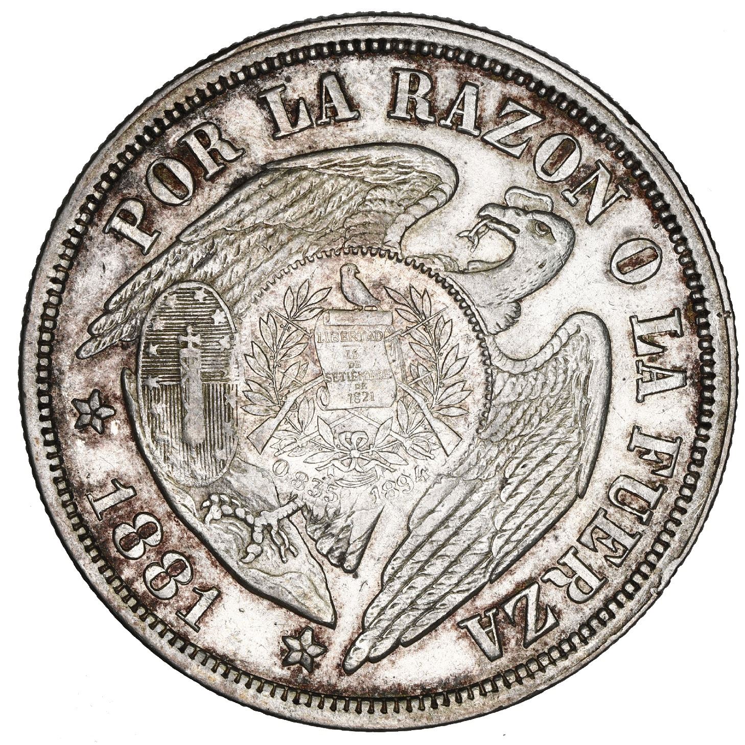 Guatemala, 1 peso,  1/2 real  counterstamp of 1894 on a Santiago, Chile, 1 peso, 1881, NGC AU 53, c/