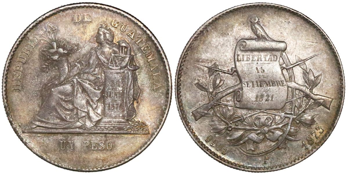 Guatemala, 1 peso, 1873P, no period in fineness. KM-197.1. 25.34 grams. AU with rainbow toning. Fineness reads "0900" rather than "0.900". This issue was struck on a 25.4 grams standard making it heavier than the French official standard per the law of 1869, causing the French-standard coins to circulate instead.