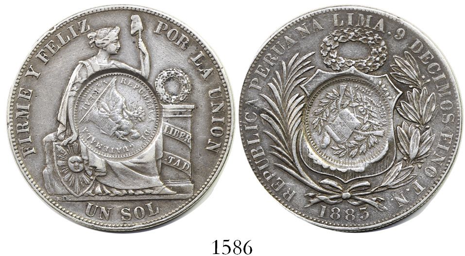 Guatemala, 1 peso, 1894, "1/2 real" counterstamp on a Lima, Peru, 1 sol of 1883 (key date). KM-224 24.82 grams. Nicely toned XF (both host and countermark), tiny rim-nick, the undercoin rare.