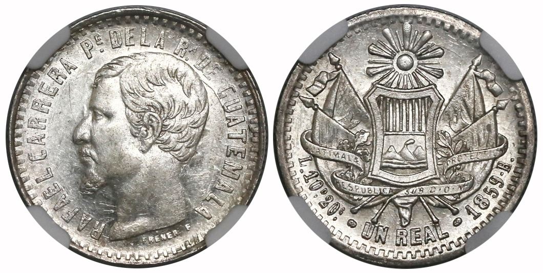 Guatemala, 1 real, 1859R, NGC MS 61, KM Plate Coin (stated on label).