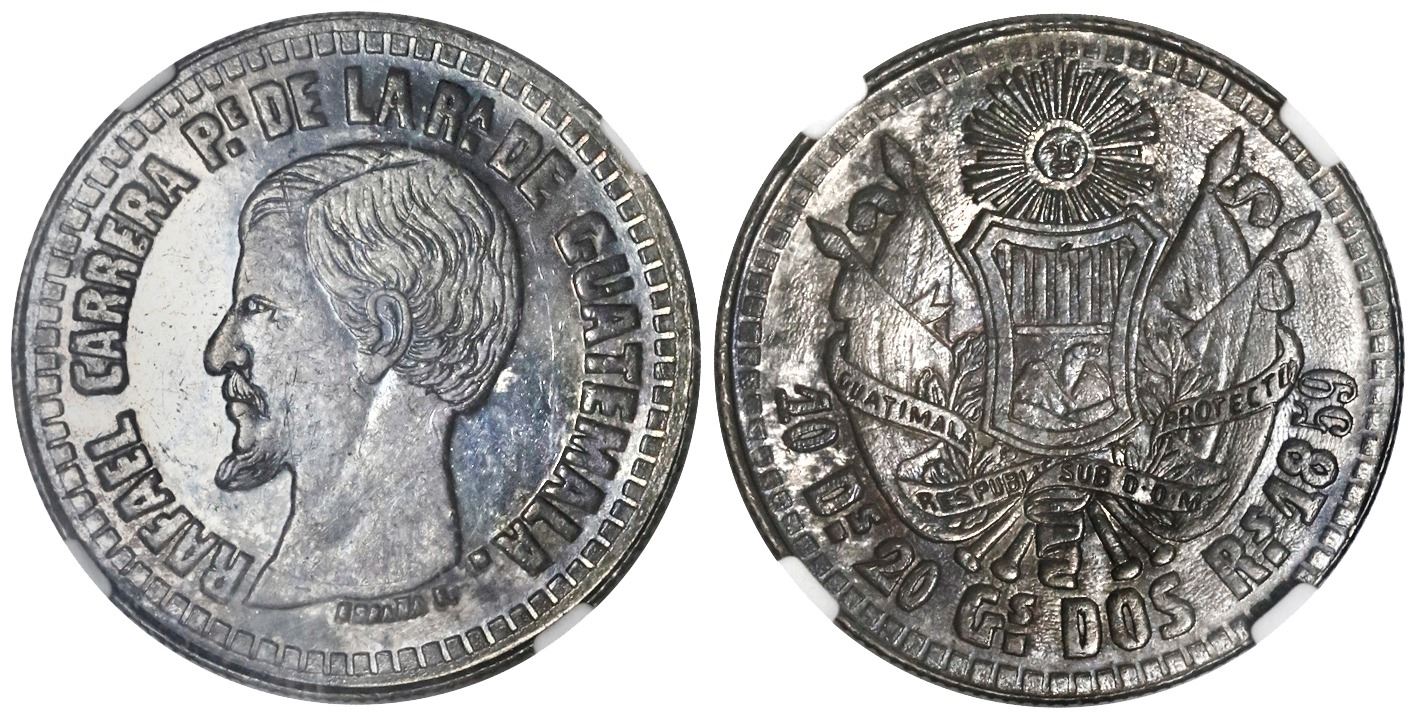 Guatemala, 2 reales, 1859, Carrera, NGC MS 62, finest known in NGC census, ex-Richard Stuart (stated on label). KM-133. Very deeply blue-toned over muted luster, minimal marks and wear on very highest points only, very rare grade for this one-year type (which is often found holed or repaired) with thick lettering in legends. Pedigreed to the Richard Stuart collection. NGC #4825020-001.