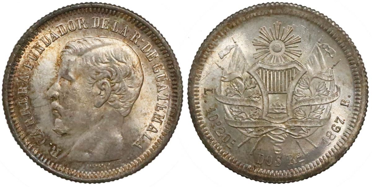 Guatemala, 2 reales, 1867R, Carrera. KM-142. 6.17 grams. Lustrous Mint State with amber toning on obverse but bright white reverse.