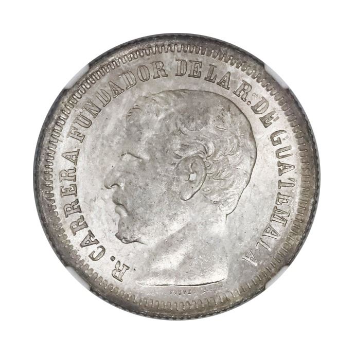 Guatemala, 2 reales, 1867R, NGC MS 64, KM Plate Coin. KM-142. Brilliant surfaces with very minor surface chatter for the grade, mostly non-toned. NGC #4770572-034. Plate Coin in the Standard Catalog of World Coins 1801-1900.