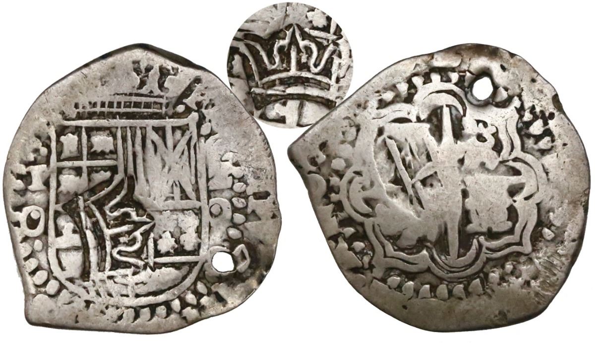 Guatemala, 2 reales "moclon," crown countermark (Type II, 1662) on a Potosi, Bolivia, cob 2 reales, Philip IV, assayer O (1650), rare. CT-Type 175; KM-B1.4. 5.86 grams. Very full flan with bold full countermark (VF), full interior details on host (Fine), nicely toned, two assayers, holed near top of cross.