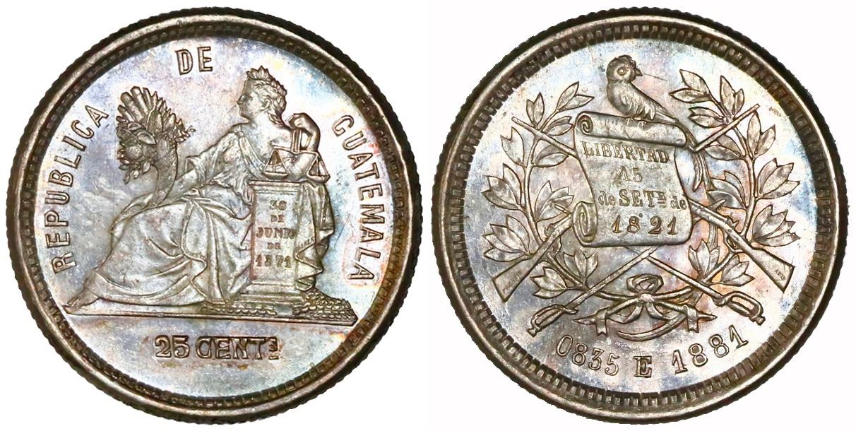 Guatemala, 25 centavos, 1881E, NGC MS 64, finest known in NGC census. KM-205.1. Light rainbow toning over muted luster, no wear or marks, top grade. NGC #4700592-003.
