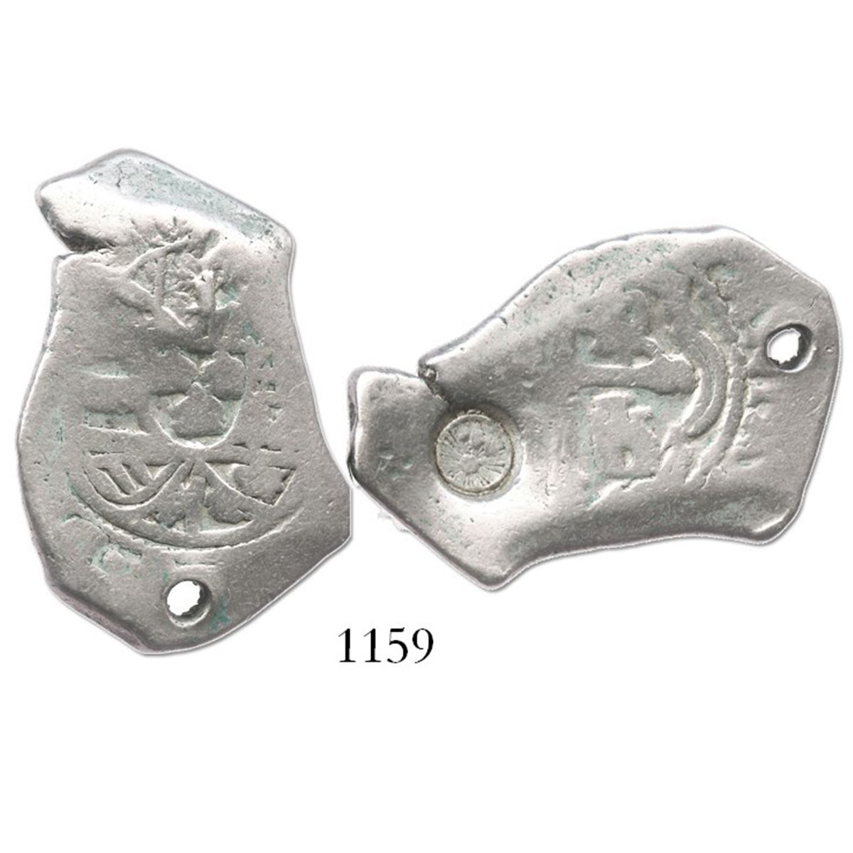 Guatemala, 4 reales, sun-over-mountains countermark (Type II, 1839) on a Mexican cob 4R of Philip V (assayer not visible), unlisted host. KM-unl. 12.9 grams. Curious shape, with very deep (AVF) countermark on non-toned Fine host with good full shield, holed near edge.