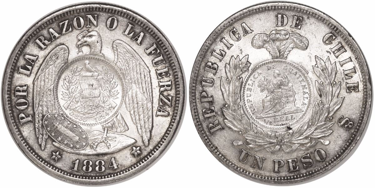 Guatemala, 8 reales, 1/2-real counterstamp of 1894 on a Santiago, Chile, 1 peso, 1884. 24.74 grams. AU with luster and incipient toning around details.