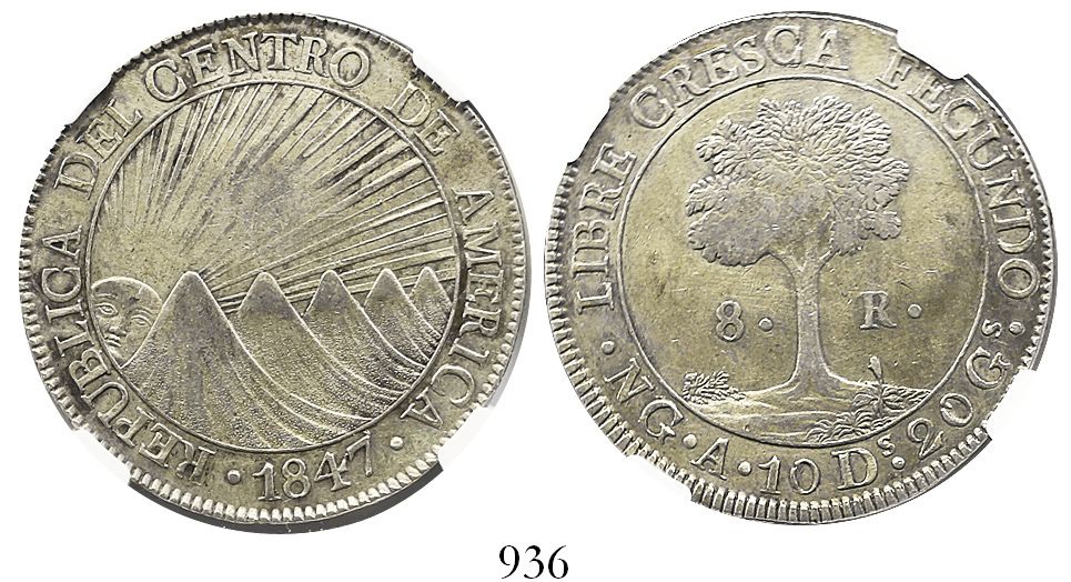 Guatemala, 8 reales, 1847A, encapsulated NGC AU details / surface hairlines. KM-4 Lustrous and very lightly toned, most of tree slightly weak as usual and with hairlines in fields, still a competent specimen of a popular type.