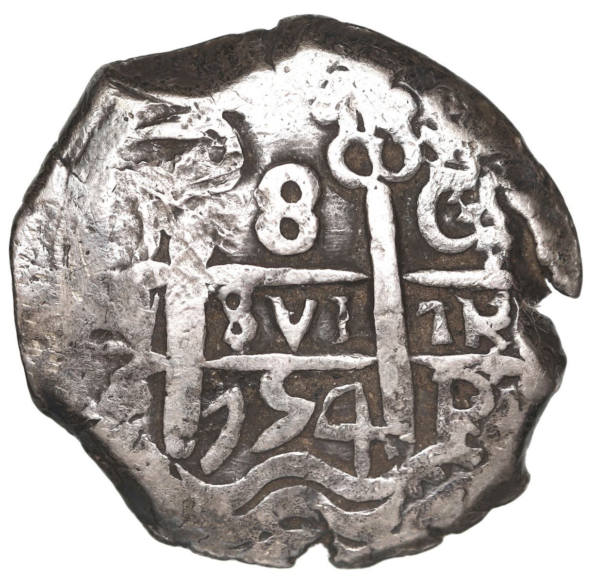 Guatemala, 8 reales, sun-over-mountains (Type II, 1839) countermark on cross side of a Potosi, Boliv