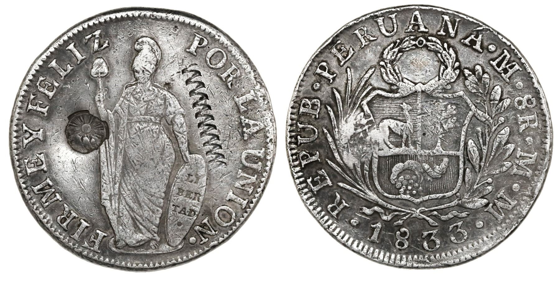 Guatemala, 8 reales, sun-over-mountains countermark (Type II, 1839) on Liberty side of a Lima, Peru,
